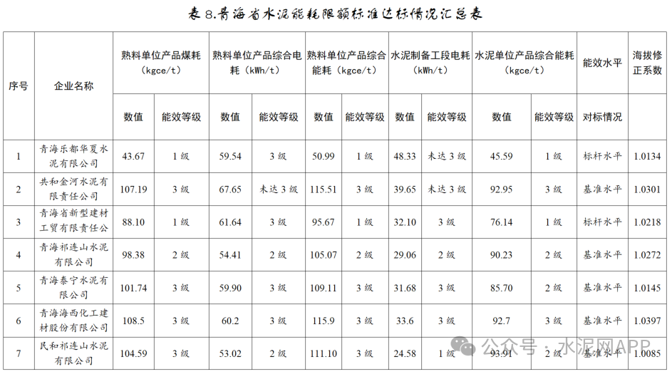 其中,青海樂都華夏水泥有限公司、青海省新型建材工貿(mào)有限責任公司兩家水泥企業(yè)能效水平達到標桿水平,其余企業(yè)為基準水平: