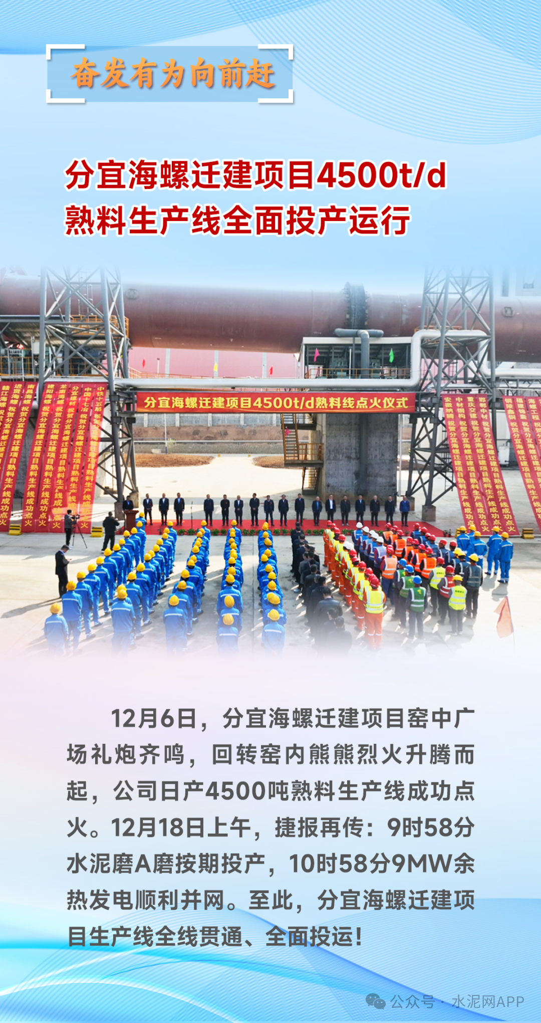 據(jù)海螺集團(tuán)發(fā)布,12月6日,分宜海螺遷建項(xiàng)目窯中廣場禮炮齊鳴,回轉(zhuǎn)窯內(nèi)熊熊烈火升騰而起,公司日產(chǎn)4500噸熟料生產(chǎn)線成功點(diǎn)火。12月18日上午,捷報(bào)再傳:9時(shí)58分水泥磨A磨按期投產(chǎn),10時(shí)58分9MW余熱發(fā)電順利并網(wǎng)。至此,分宜海螺遷建項(xiàng)目生產(chǎn)線全線貫通、全面投運(yùn)!