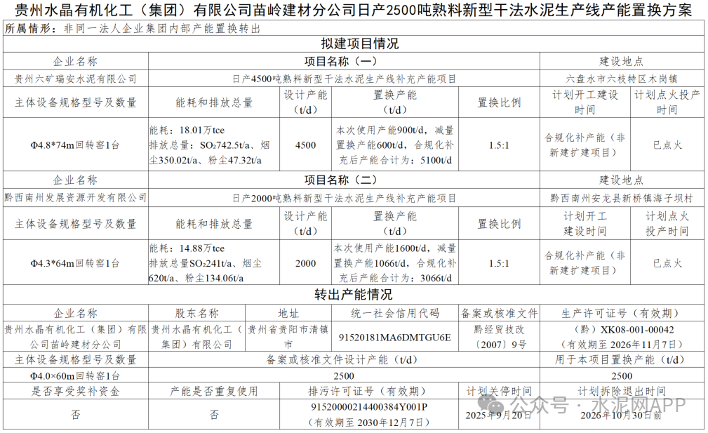 2025年12月31日,貴州省工信廳發(fā)布“關(guān)于貴州水晶有機(jī)化工(集團(tuán))有限公司苗嶺建材分公司日產(chǎn)2500噸熟料新型干法水泥生產(chǎn)線產(chǎn)能置換方案的公示”。