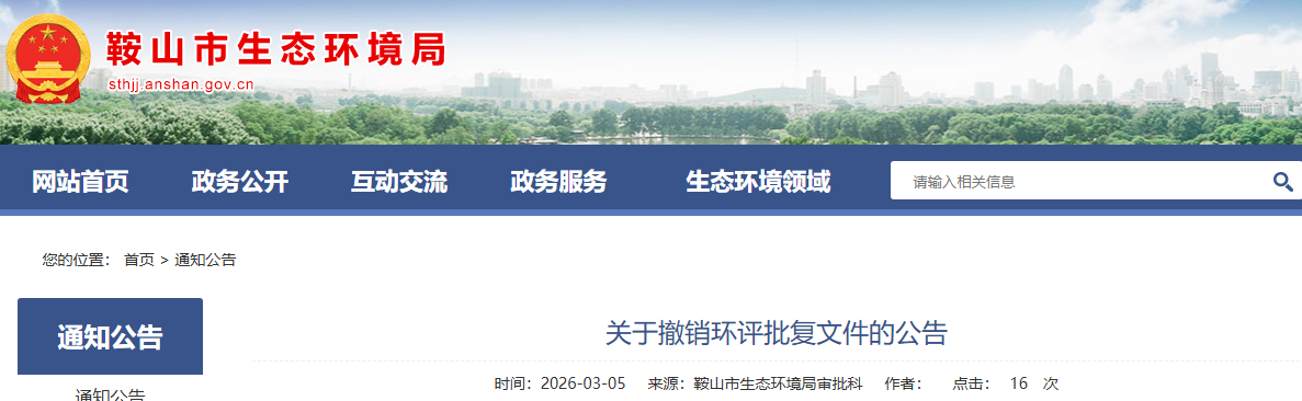鞍山市行政審批局于2022年11月15日對《海城市牌樓鎮(zhèn)興源鎂制品廠改擴建項目環(huán)境影響報告表》下達了環(huán)評批復,批復文號為:鞍行審批復環(huán)〔2022〕76號?,F(xiàn)建設單位申請撤銷該環(huán)評批復,依據(jù)《中華人民共和國行政許可法》第六十九條規(guī)定,經(jīng)研究,我局依法決定撤銷《海城市牌樓鎮(zhèn)興源鎂制品廠改擴建項目環(huán)境影響報告表的批復》(鞍行審批復環(huán)〔2022〕76號),現(xiàn)予以公告。