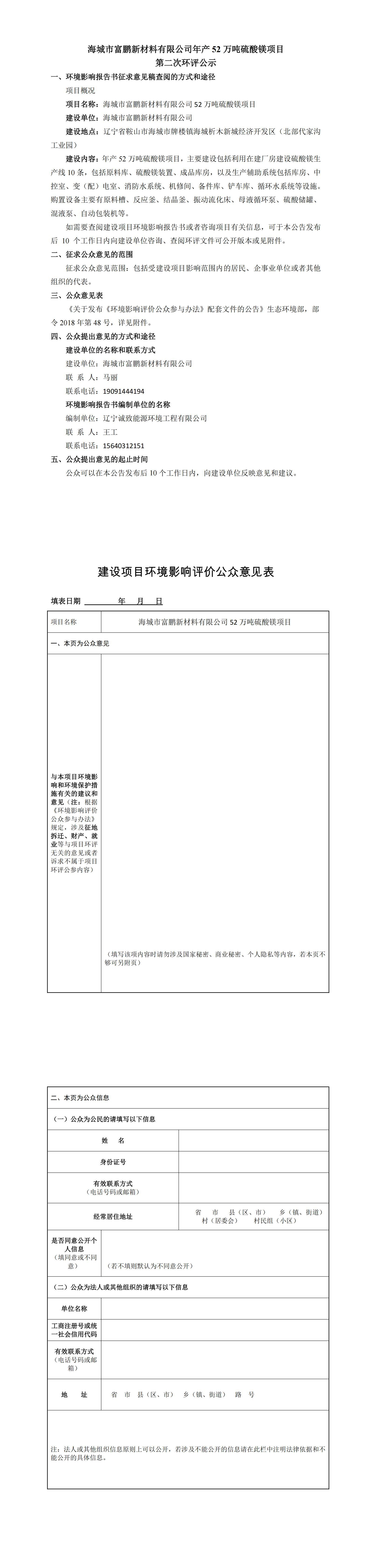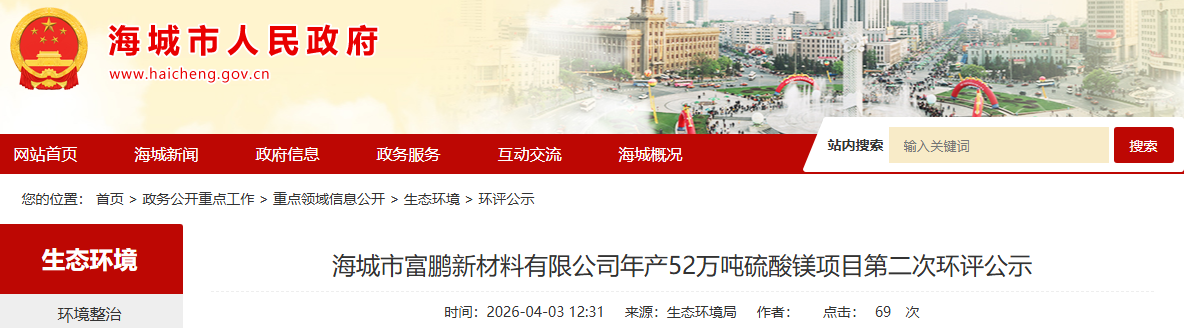 海城市富鵬新材料有限公司年產52萬噸硫酸鎂項目第二次環(huán)評公示